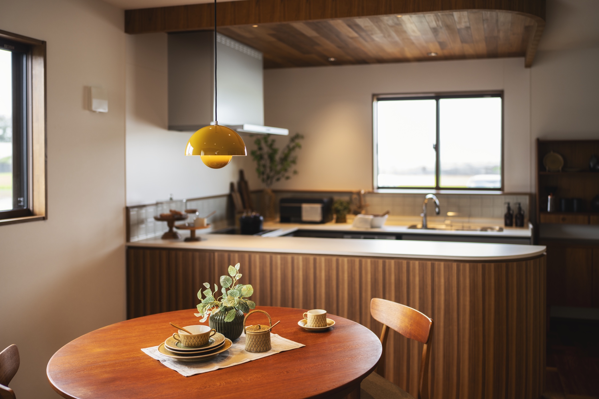 また、ヴィンテージ食器を小物雑貨として随所に配し、暮らしのシーンをさりげなく演出。マスタードやグリーンをアクセントカラーとして取り入れることで、北欧らしい彩りと遊び心を加え、空間全体に温かなリズムを生み出しています。